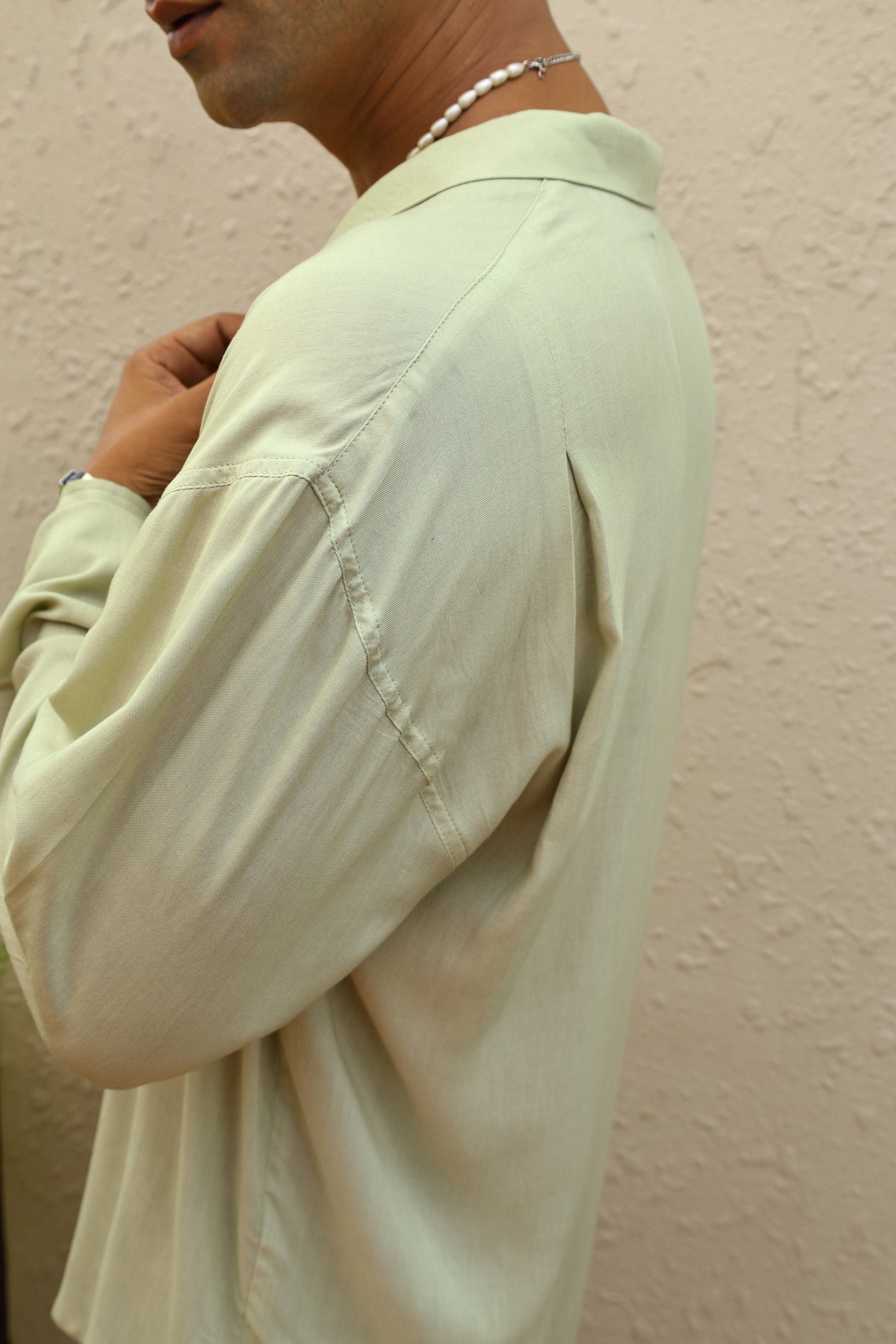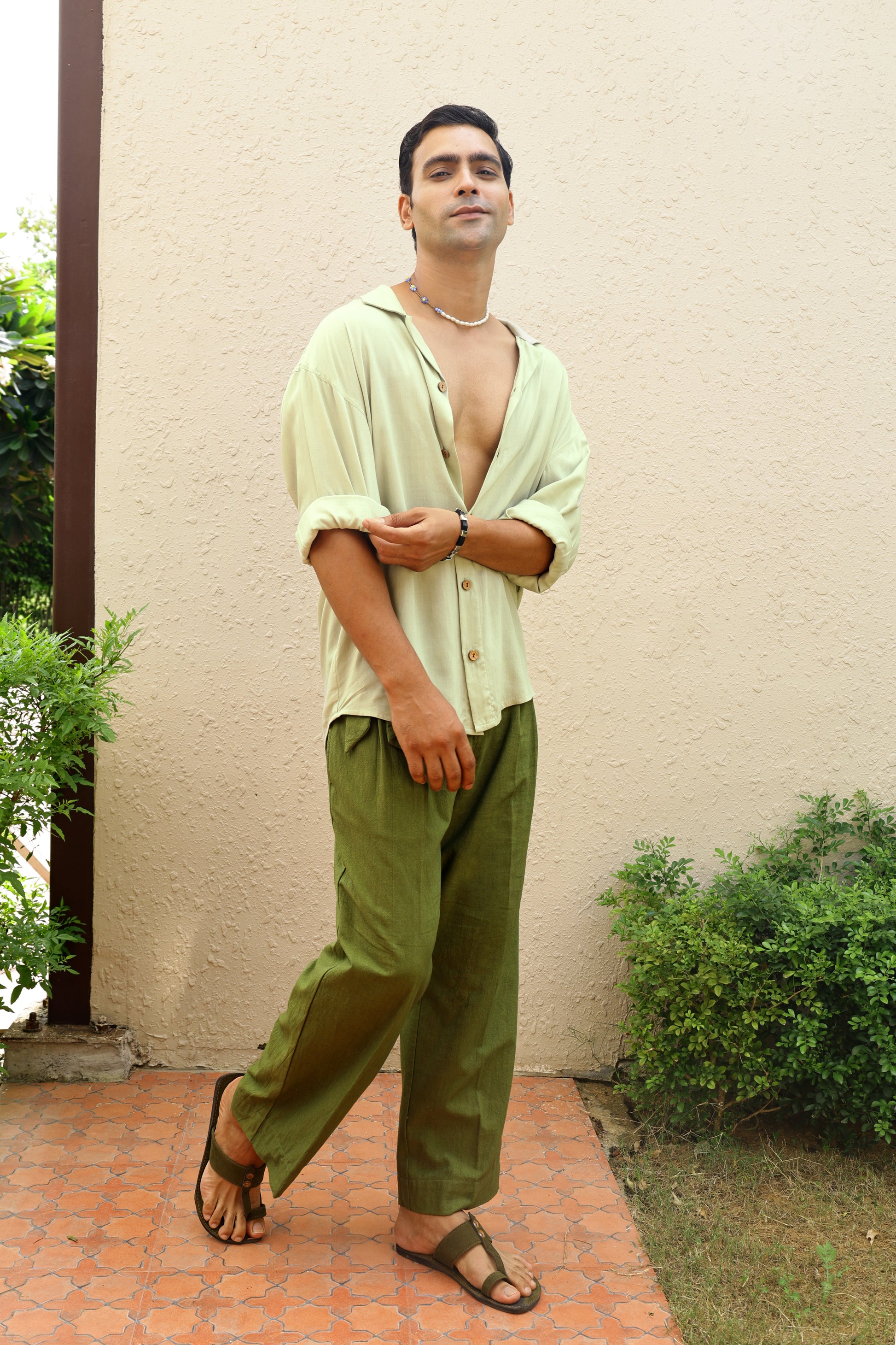 Discover The Lagoon Co-Ords — a fine blend of comfort and style. The mint green shirt paired with the olive green trousers sets the tone for a perfect contrast palette play. With the oversized silhouette of the shirt, complemented by comfort of the double pleat loose trousers, this set is ideal for those leisurely strolls while exploring a new destination.